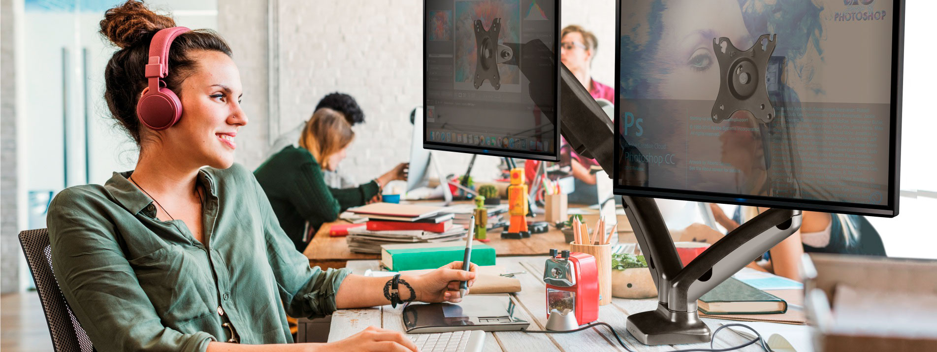 Настольный кронштейн ONKRON D221E для установки двух мониторов с диагональю от 10 до 32″. Обеспечивает полную свободу регулировки и экономит место на столе.