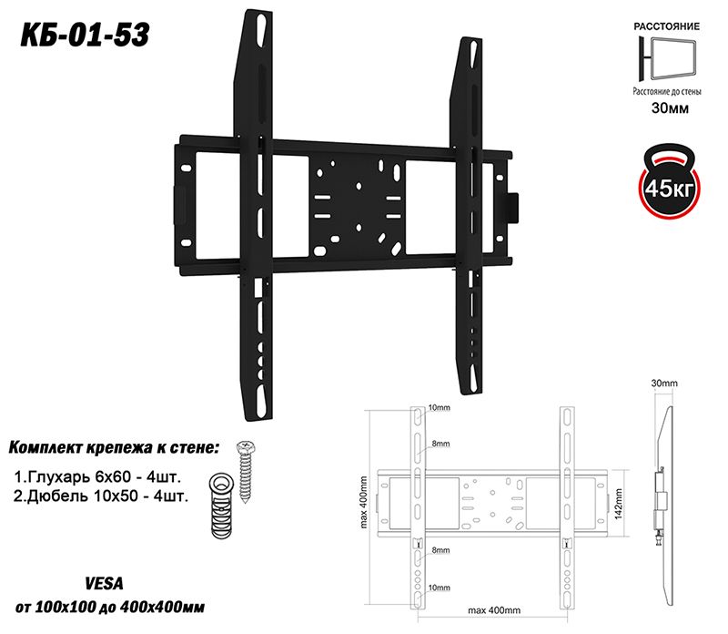 Кронштейн для телевизора КБ-01-53 — это прочное и надёжное фиксированное крепление, предназначенное для телевизоров с диагональю от 32 до 55 дюймов. Совместим с множеством популярных стандартов VESA: от 100×100 до 400×400 мм.